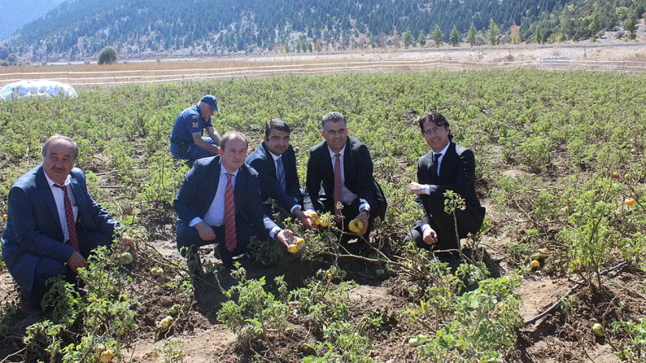 Konuşmaların ardından protokol, yerli sarı domates ekili alanları gezerken, üreticiler tarafından yetiştirilen ve içi, dışı tamamen sarı renk olan ürünü inceledi.