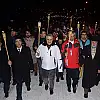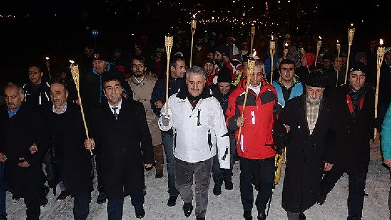 Sarıkamış ilçesindeki Gaziler Meydanı'nda toplanan çok sayıda kişi, ellerinde meşalelerle yaklaşık 3 kilometrelik yürüyüşün ardından Yukarı Sarıkamış Şehitliği'ne geldi.