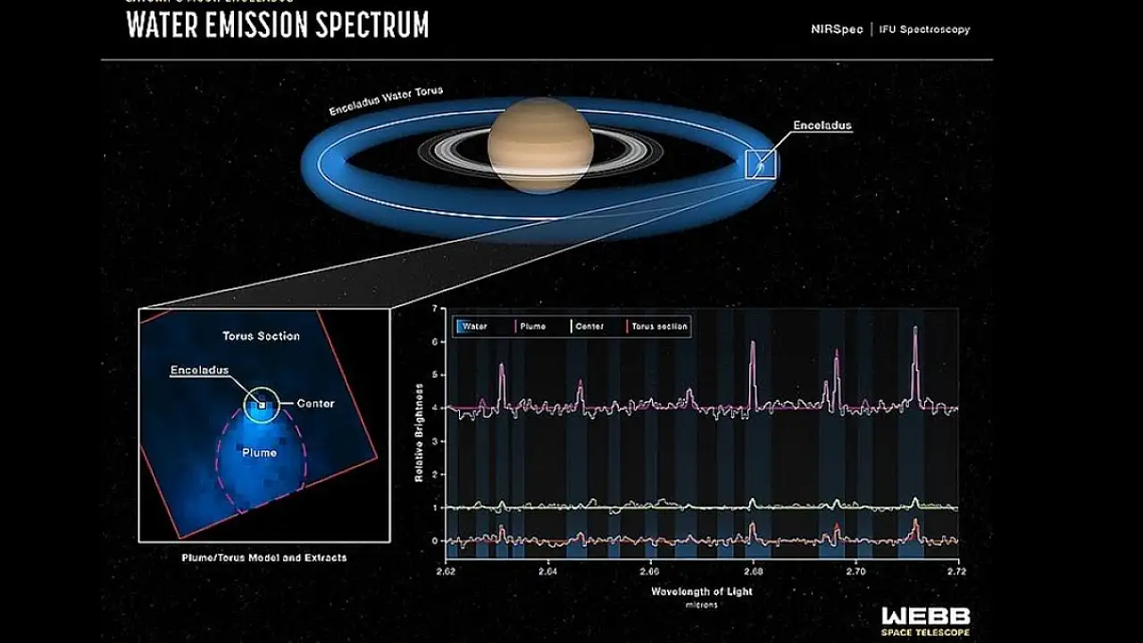 James Webb Uzay Teleskobu'nun kaydettiği görüntüleri inceleyen astronomlar, Satürn'ün buzla kaplı uydusu Enceladus'tan uzaya fışkıran 6 bin 600 kilometrelik dev su buharı sütununu tespit etti.