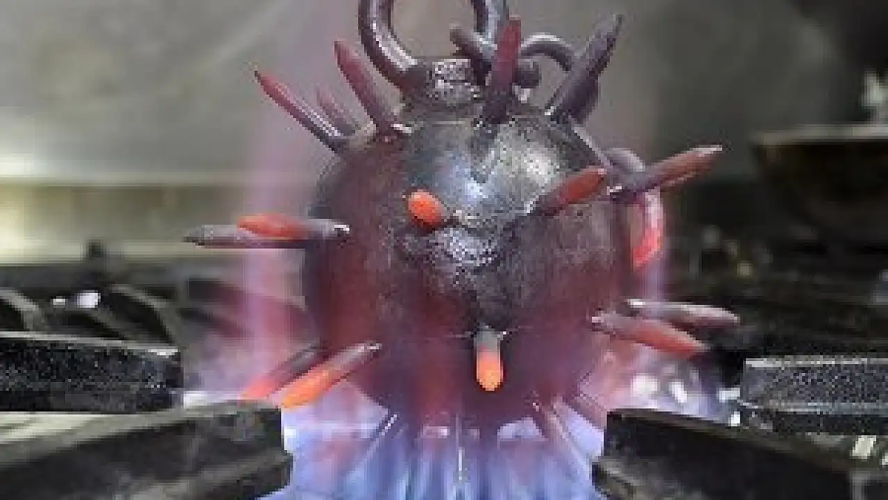 Ateşte 500 dereceye kadar ısıtılan ve Fatih Sultan Mehmed'in İstanbul'un fethi sırasında toplarını soğuttuğu gibi yağla ısısı 250 dereceye kadar düşürülen topuzun çıkıntılarına önce az pişirilmiş et çeşitleri diziliyor.