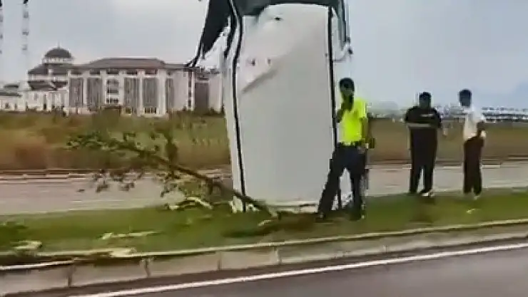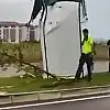 BURSA'da, yağmur sebebiyle kayganlaşan yolda sürücüsünün direksiyon hakimiyetini kaybettiği kamyonet savrulup, refüjde dik durdu. Sürücü F.D.'nin kamyonet içerisinde sıkıştığı kaza, yoldan geçen diğer sürücüler tarafından cep telefonu kamerasıyla görüntülendi.