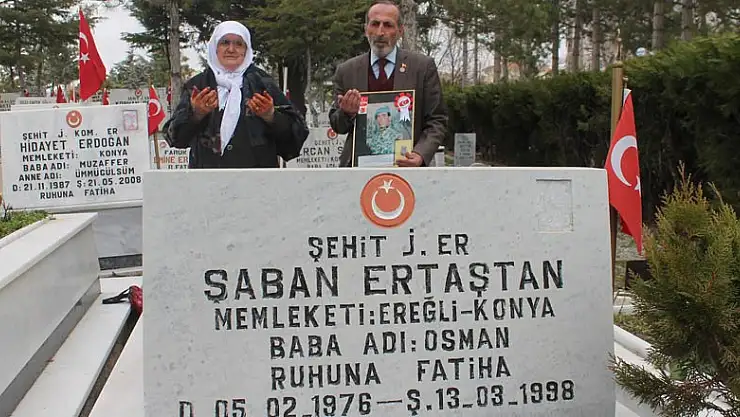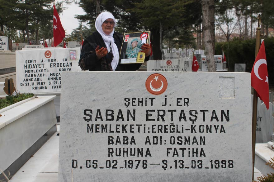 Konya'nın Ereğli ilçesinde yaşayan şehit annesi, 1998 yılında Kuzey Irak'a kaçırılarak şehit edilen oğlunun naaşı getirilemeyince boş mezara gidip dua ediyor.