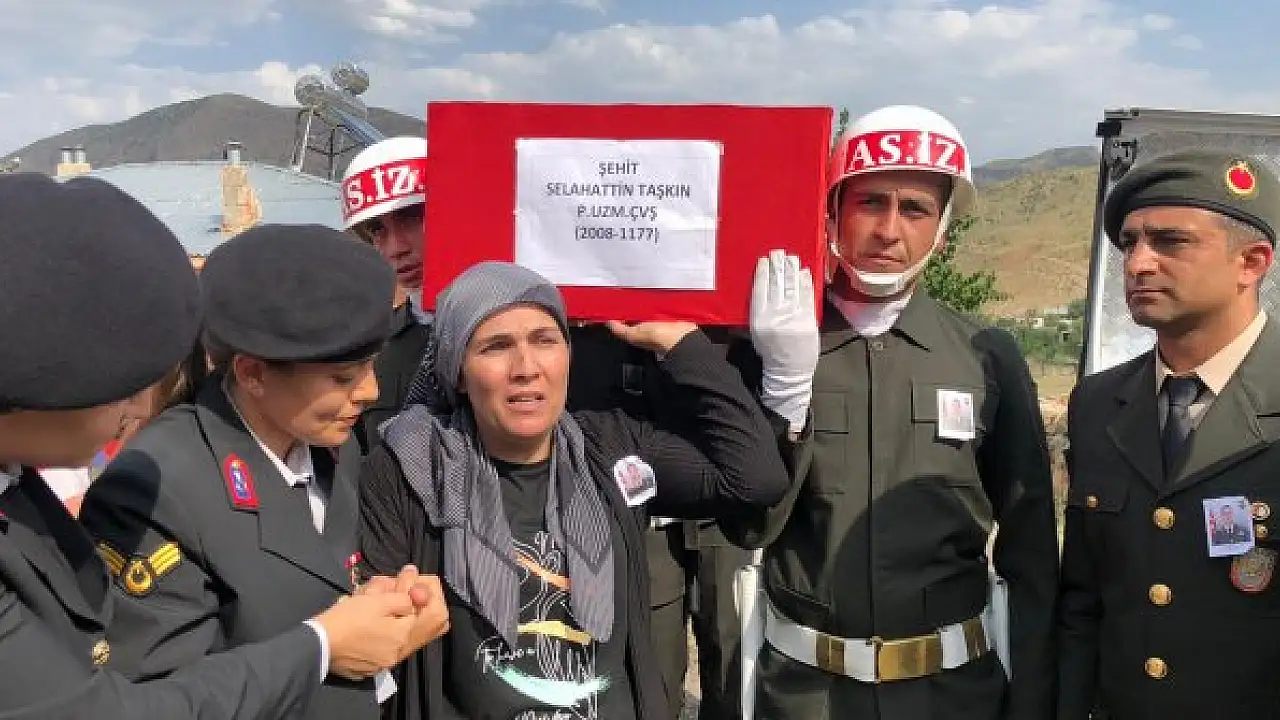 PENÇE- Kilit Harekatı bölgesine sızmaya çalışan teröristlerle çıkan çatışmada ağır yaralanıp, kaldırıldığı hastanede şehit olan Piyade Uzman Çavuş Selahattin Taşkın (38), Erzurum'un Oltu ilçesinde toprağa verildi. Saniye Taşkın, şehit eşinin Türk bayrağına sarılı tabutunu askerlerle beraber taşıdı.
