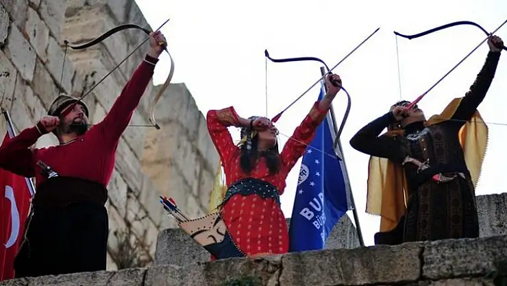 18 Mart Şehitleri Anma Günü ve Çanakkale Deniz Zaferi'nin 102. yılı dolayısıyla Bursa'da düzenlenen etkinlikte okçular, tarihi surların üzerinden atış yaptı.