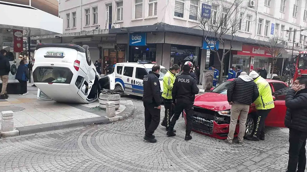 Balıkesir'in Bandırma İlçesinde Kaşf Acar Caddesi üzerinde meydana gelen trafik kazasında otomobille çarpışan hafif ticari araç takla attı.
