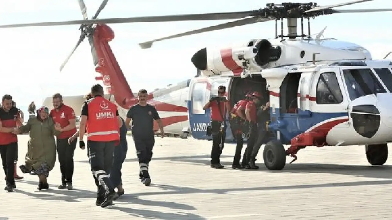 Kastamonu'da sel nedeniyle elektrik kesintisi yaşanan köylerindeki diyaliz hastaları, hastaneye helikopterle götürülüyor.