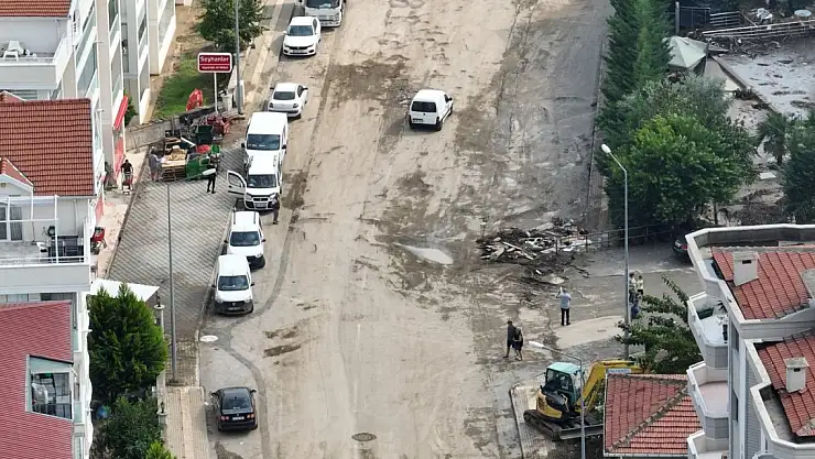 Hasar tespit çalışmalarının sürdüğü ilçede, sel felaketinin neden olduğu hasar havadan görüntülendi. Ev ve işyerlerinin sel suları altında kaldığı, araçların sürüklendiği Halitpaşa Mahallesi, dron ile görüntülendi.