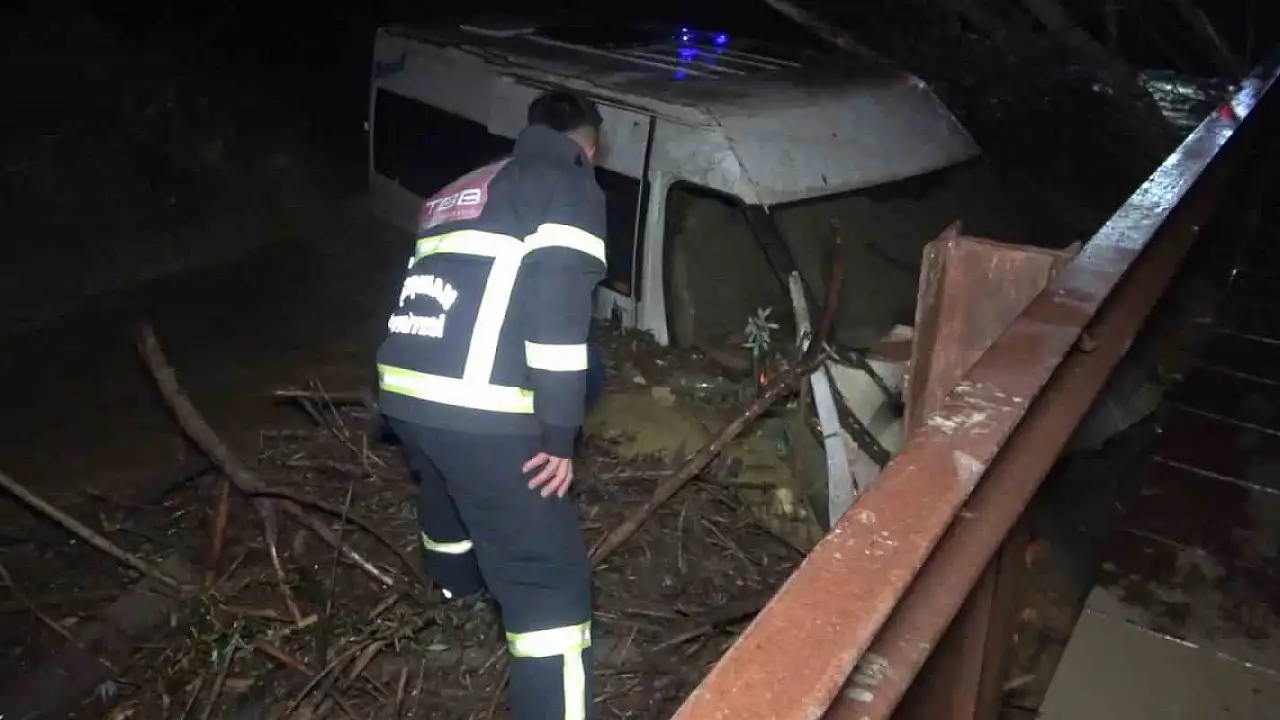 Kırıkkale'de gece vardiyasından dönen işçilerin bulunduğu minibüs dağ yamacından inen sel sularının etkisiyle dereye yuvarlandı.