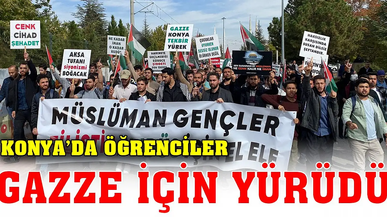 Selçuk Üniversitesi Alaaddin Keykubat Kampüsü'nde öğrenciler Türk ve Filistin bayraklarının yanı sıra ellerinde "Aksa Tufanı Siyanizmi Boğacak", "Gazze Konya'ya Tekbir Yürek" gibi yazılı döviz ve pankartlarla İsrail'e tepkilerini dile getirdiler.