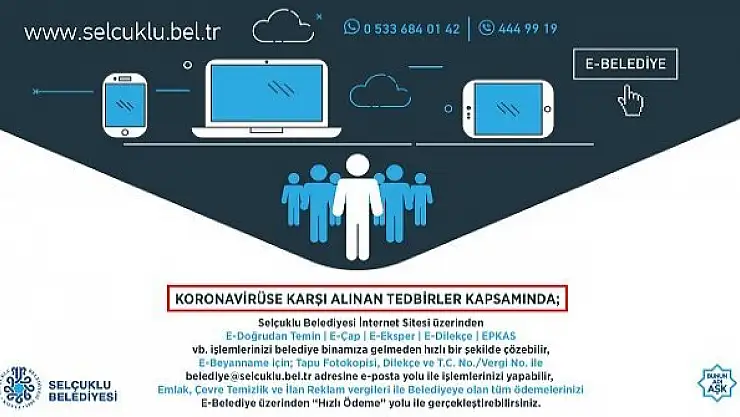 Selçuklu Belediyesi, Koronavirüs mücadelesi kapsamında vatandaşların belediye binasındaki işlemlerini e-belediye üzerinden yapmaları çağrısında bulundu.