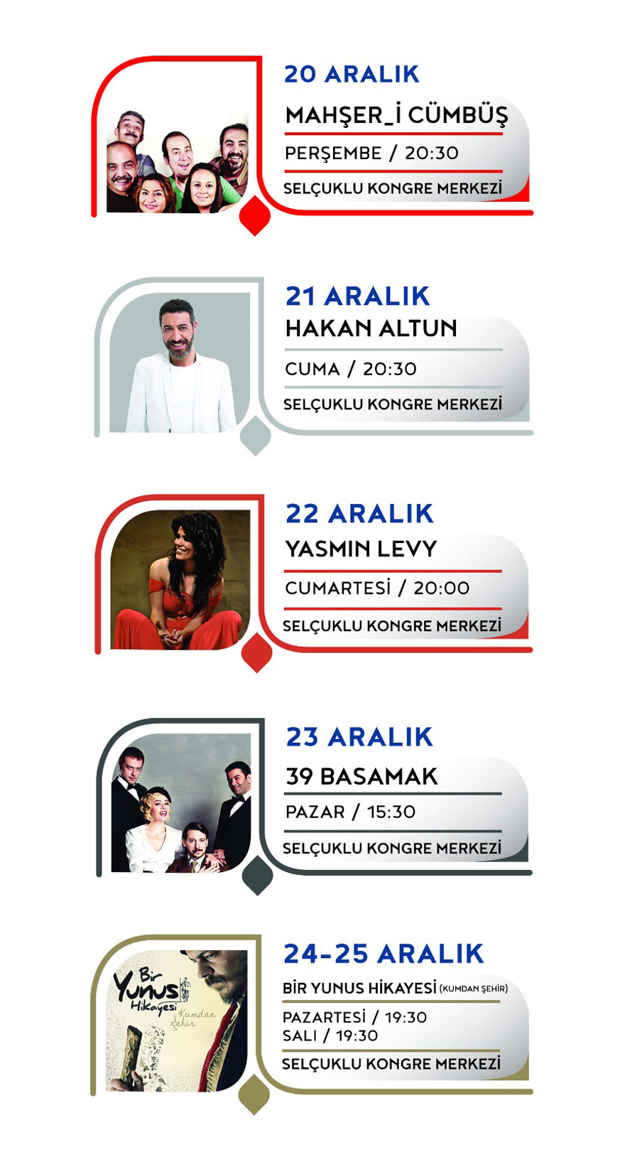Aşk şarkılarının sevilen ismi Hakan Altun, 21 Aralık Cuma akşamı saat 20:30’da Selçuklu Kongre Merkezi Anadolu Oditoryum'da müzikseverlerle buluşacak. Latin ve Sefarad müziğinden İspanyol flamenkosuna Arjantin tangosundan Portekiz fadosuna kadar dünyanın farklı coğrafyalarında müzikleri harmanlayan Yasmin Levy, 22 Aralık Cumartesi saat 20:00’de Türk ezgileriyle de dinleyicilerini farklı bir müzikal yolculuğa davet edecek.