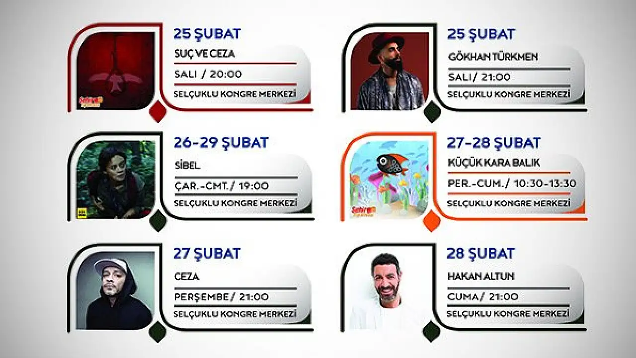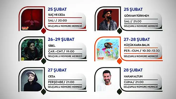 Selçuklu Kongre Merkezi’nin etkinlik takvimi yine dolu dolu. Kendine özgü tarzıyla pop müziğin güçlü isimlerinden başarılı sanatçı Gökhan Türkmen, geniş repertuvarıyla 25 Şubat 2020, salı günü saat 21:00’ da Selçuklu Kongre Merkezi Anadolu Oditoryum sahnesinde. Karadeniz’ in ıslık diliyle konuşulan, küçük bir köyünde babası ve kız kardeşiyle yaşayan Sibel’in hikayesi de izleyiciyle buluşacak. Sibel, 26-29 Şubat 2020, çarşamba-cumartesi günleri saat 19:00’ da SKM Cep Sineması’ nda sinema severlerle buluşacak. Türkçe Rap müziğin sevilen isimlerinden Ceza, 27 Şubat 2020, perşembe günü saat 21:00’ da Selçuklu Kongre Merkezi’ nde sevenleri ile bir araya gelecek. Küçük Kara Balık ise, 27-28 Şubat 2020, perşembe-cuma günleri saat 10:30 – 13:30 seansları ile SKM Konya Oditoryum’ da sizleri bekliyor. Türk arabesk müziğinin güçlü sesi Hakan Altun, Selçuklu Kongre Merkezi’ nde sahne alacak. Hakan Altun, 28 Şubat 2020, cuma günü saat 21:00’ da Selçuklu Kongre Merkezi Anadolu Oditoryum sahnesinde.