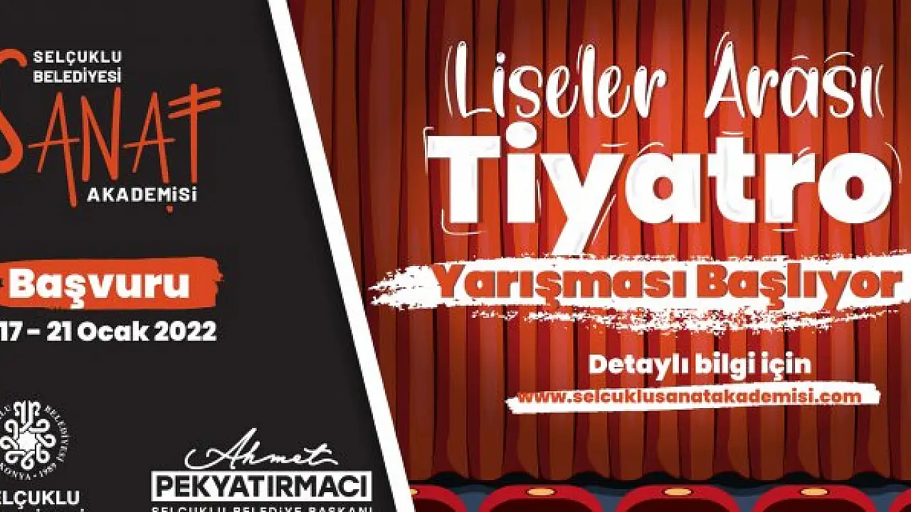 Selçuklu’da kültürün ve sanatın yeni merkezi olan Selçuklu Sanat Akademisi düzenlediği etkinliklerle sanat hayatına katkı sunuyor. Selçuklu Belediyesi çatısı altında çalışmalarını sürdüren Selçuklu Sanat Akademisi düzenleyeceği tiyatro yarışmasıyla öğrencilere tiyatroyu sevdirmeyi ve gelecek yaşamlarında tiyatroyu hayatlarını bir parçası haline getirmeyi planlıyor. Liseler arası tiyatro yarışmasında ilçe genelindeki tüm liseler katılabilecek. Müdürlük bazında başvuru yapılacak yarışmada Selçuklu Sanat Akademisi tarafından belirlenecek üç farklı tiyatro oyununu sergileyecek. Sergilenecek oyunlarda jüri tarafından birinciliğe layık görülen okullara 50 bin TL ödül verilecek.