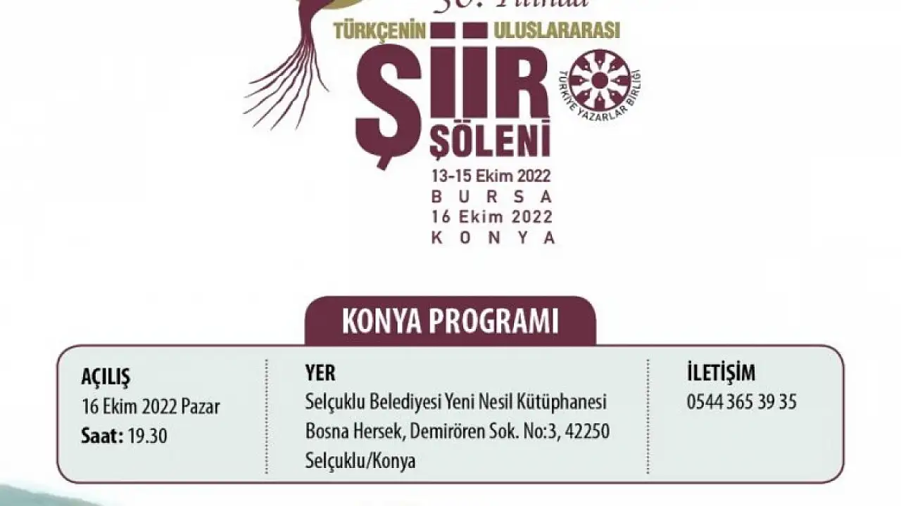 Türkiye Yazarlar Birliği tarafından 15'incisi düzenlenen "Türkçe'nin Uluslararası Şiir Şöleni", 13 Ekim Perşembe günü Bursa’da başladı. Kısa adı TİKA olan Türk İşbirliği ve Koordinasyon Ajansı Başkanlığı’nın desteklediği programın ilk iki gününe Bursa Büyükşehir Belediyesi, Pazar günü yapılacak son iki fasıla da Konya Selçuklu Belediyesi'nin ev sahipliği yapacak.