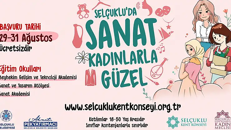 Selçuklu Belediyesi ve Selçuklu Kent Konseyi Kadın Meclisi tarafından gerçekleştirilecek olan 'Selçuklu'da Sanat Kadınlarla Güzel' projesi kapsamındaki kurs başvuruları başladı. Eğitimler için son başvuru tarihi 31 Ağustos.