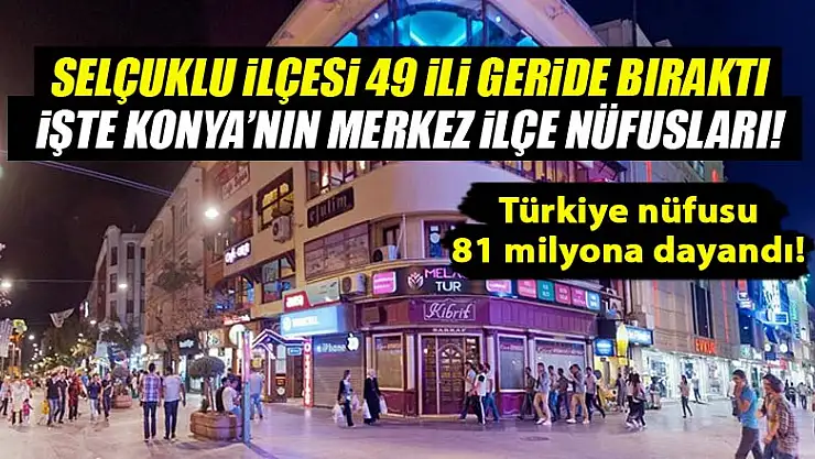 Türkiye'nin nüfusu bugün açıklandı. Yapılan açıklamaya göre Türkiye nüfusu 81 milyona dayandı. Yapılan sayıma göre, 639 bin 450 nüfuslu Konya'nın Selçuklu ilçesi nüfusuyla 49 ili geride bıraktı.