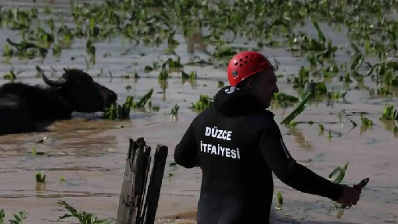 Düzce'de etkili olan selde çok sayıda hayvan telef olurken, bazı bölgelerde de sel suları yüzünden mahsur kalan hayvanları kurtarmak için çalışma başlatıldı.