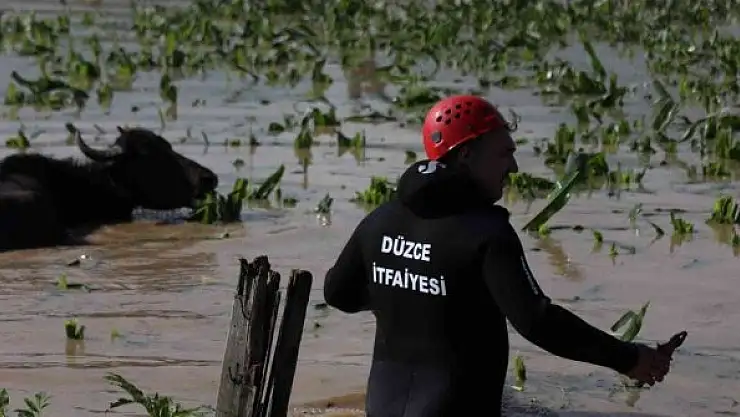 Düzce Belediyesi İtfaiye ekipleri, selde mahsur kalan hayvanları kurtarma operasyonu düzenledi.