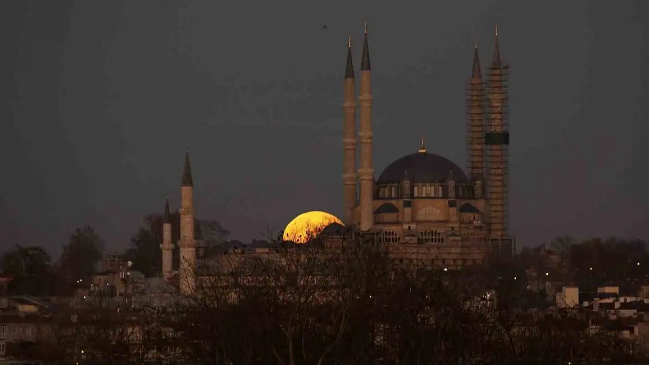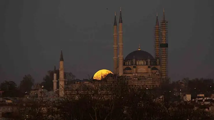 Edirne'de gökyüzünden beliren yılın son dolunayı ile Selimiye Camii'nin görüntüsü görsel şölen sundu.