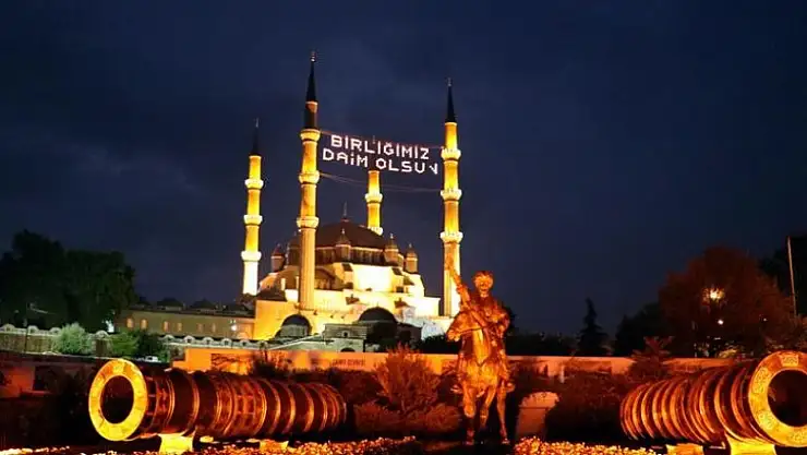 Mimar Sinan'ın ustalık eseri Selimiye Camisi'ne, 15 Temmuz Demokrasi ve Milli Birlik Günü dolayısıyla "Birliğimiz Daim Olsun" yazılı mahya asıldı.