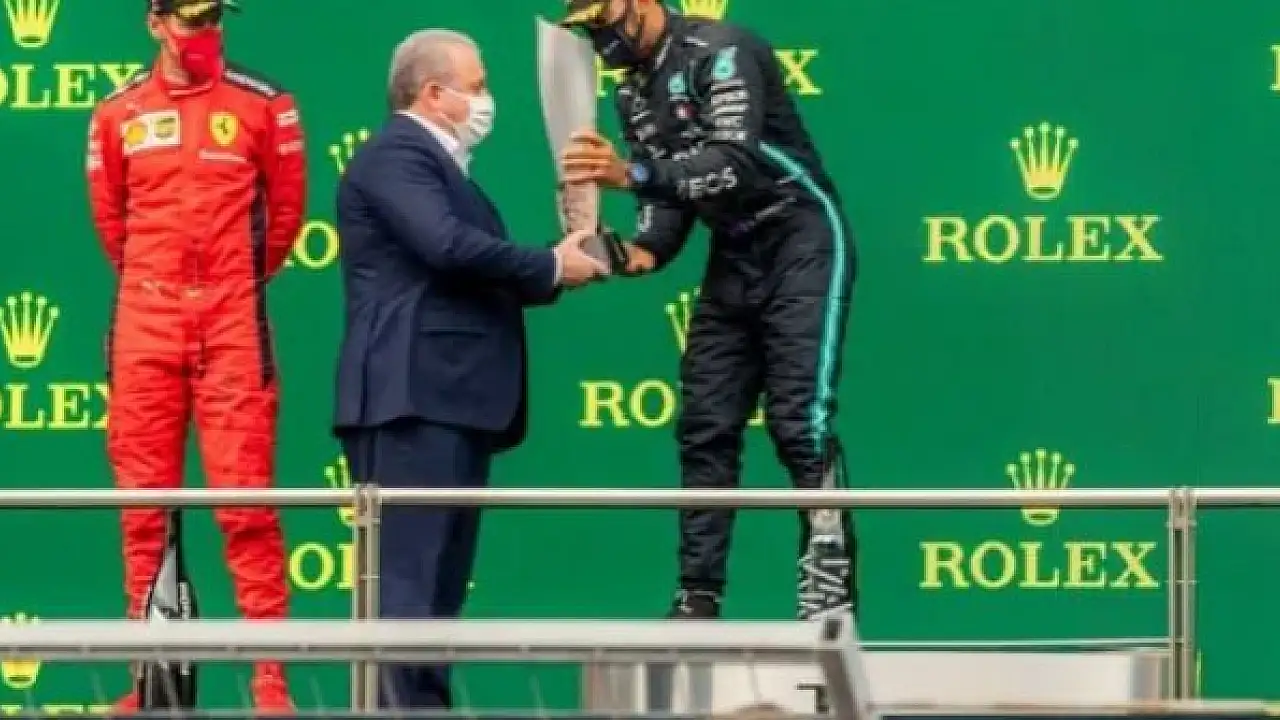 "Formula 1'in İstanbul ayağını kazanan Mercedes Pilotu Lewis Hamilton'ın yeni şampiyonluğunu podyumda tebrik edip, kupasını takdim ettik. Pist çok iyiymiş değil mi şampiyon."
