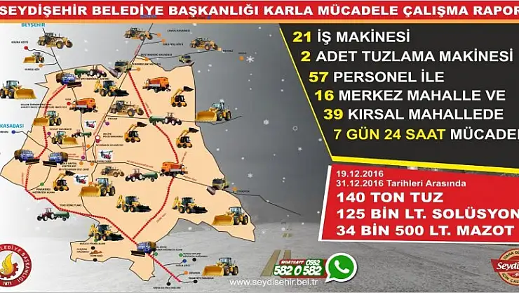 Rapora göre, kar yağışının yoğun olduğu 12 gün içerisinde Seydişehir Belediyesi’nin 21 adet iş makinesi gece-gündüz dönüşümlü olarak çalışırken, 34 bin 500 litre mazot harcaması yapıldığı belirtildi. Seydişehir Belediyesi'nin 19-31 Aralık tarihleri arasında, kar yağışının yoğun olduğu zamanda dilimi içinde karla mücadeleye yönelik iş raporu açıklandı. 12 günlük süre içinde Fen İşleri Müdürlüğü, Makine Parkı Amirliği, Destek Hizmetleri, Temizlik İşlerinin koordineli olarak çalıştığı belirtildi. Karla mücadele çalışmalarında 21 iş makinesi, 2 adet tuzlama aracı, 140 ton tuz, 125 bin litre solüsyon, 57 personelle 16 merkez, 39 kırsal mahallede 7 gün 24 saat aralıksız çalışmalar devam etti.
