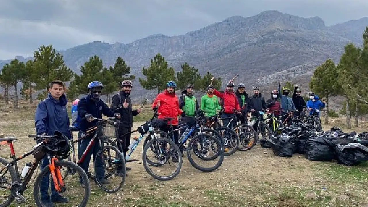Düzenledikleri bisiklet turunda mola verdikleri Pınarbaşı Tepesi'ndeki ormanlık alanda çevre temizliği yapan bisikletçiler, 1200 badem ve meşe palamudu tohumunu da toprakla buluşturdu.