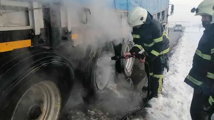 Seyir halinde lastiği patlayan tırda yangın paniği