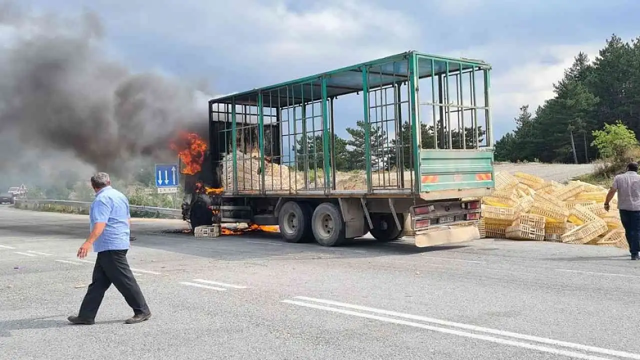 Bolu'da tavuk taşımak için kullanılan boş kasaların olduğu kamyon, seyir halindeyken yanarak kullanılamaz hale geldi.