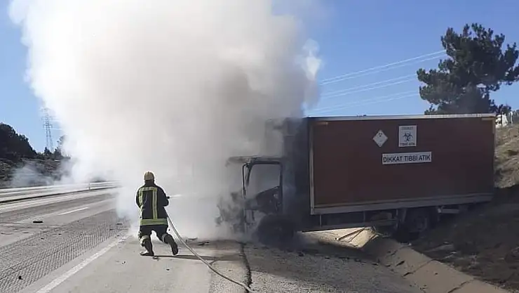 Seyir halindeki tıbbi atık aracı yandı