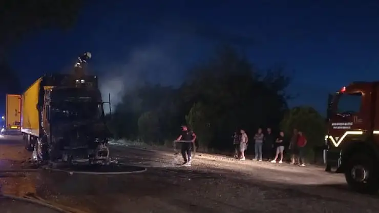 MANİSA'nın Alaşehir ilçesinde seyir halindeki TIR motor kısmından alev alırken, aracı terk eden sürücü canını son anda kurtardı. TIR'ın kupa kısmı ise yanarak küle döndü.