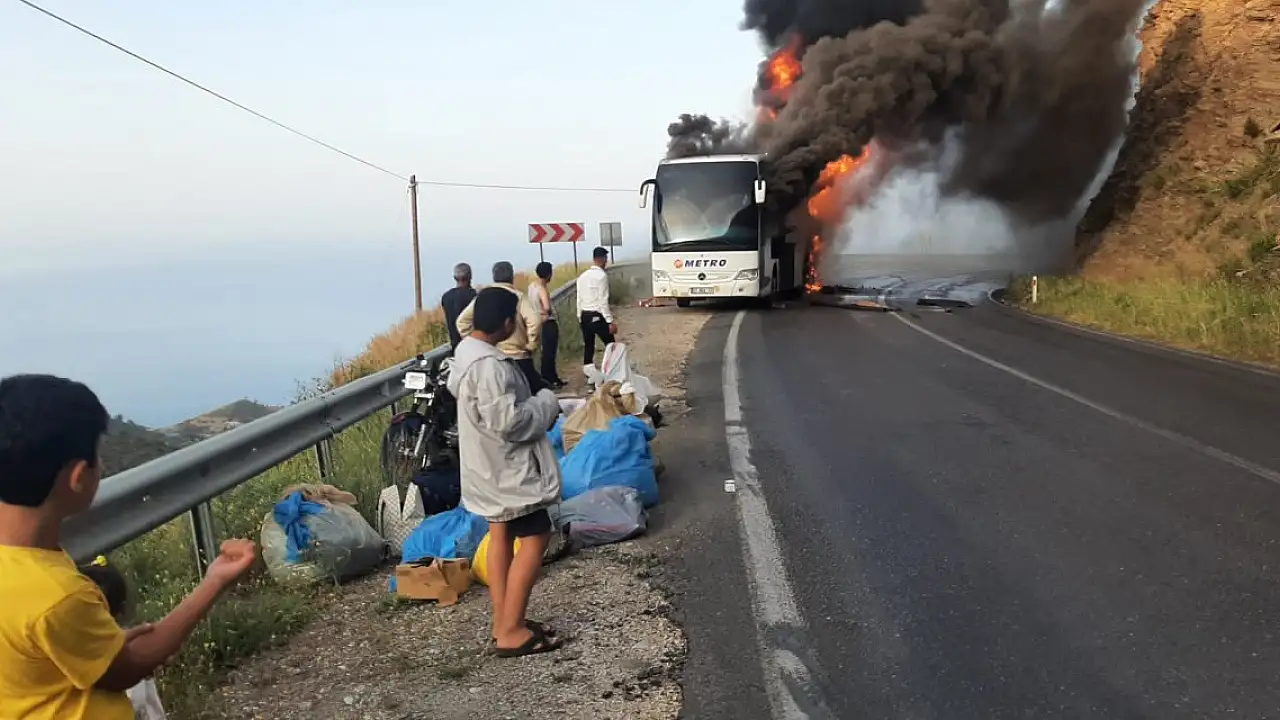MERSİN'in Anamur ilçesinde yolcu otobüsü seyir halindeyken motor kısmından alev aldı. Yolcular tahliye edilirken otobüs kullanılamaz hale geldi.