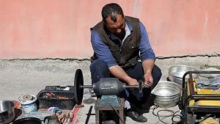 Erzincan'da aile mesleği kalaycılıkla uğraşan Serkan Erez, bakır kapların kullanımının azalması nedeniyle yılın 6 ayı Akdeniz ve Ege'deki il, ilçe ve köyleri dolaşarak müşteri arıyor.
