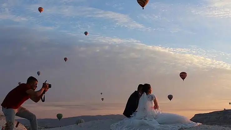 Doğal güzellikleri, tarihi ve kültürel zenginlikleriyle önemli turistik mekanlardan Kapadokya, gökyüzünü renklendiren sıcak hava balonlarının oluşturduğu manzarasıyla, düğün fotoğrafı çektirmek isteyen çiftlerin gözdesi haline geldi.