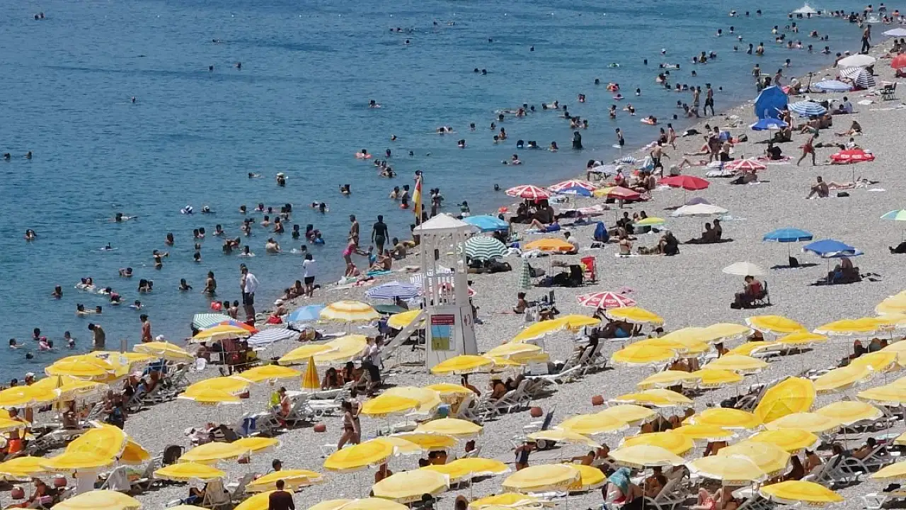 ANTALYA'da hava sıcaklığı 41 dereceye kadar ulaşırken, dünyaca ünlü Konyaaltı Sahili doldu.