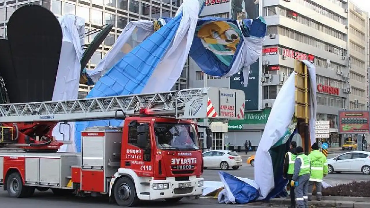 Ankara'da etkili olan şiddetli rüzgar, 15 Temmuz Kızılay Milli İrade Meydanı'ndaki bir iş merkezine asılan reklam panosunu uçurdu. Panonun yola düşmesi nedeniyle Kızılay'da trafik kısa süreli durdu.