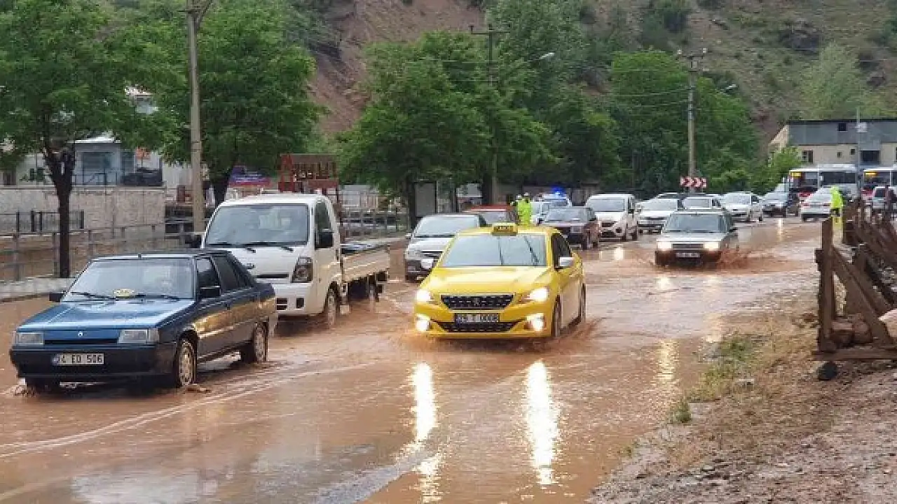 Gümüşhane'de birdenbire bastıran şiddetli yağmurun ardından caddeler göle, dik rampadaki yollar dereye döndü.