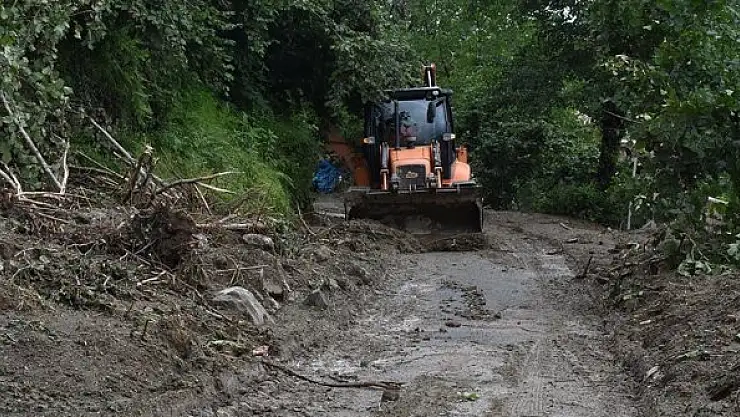Yağışa bağlı toprak kayması sebebiyle 4 evin zarar gördüğü Perşembe ilçesinin Yarlı Mahallesi'nde kapalı yolların açılması için çalışma yürütüldü.