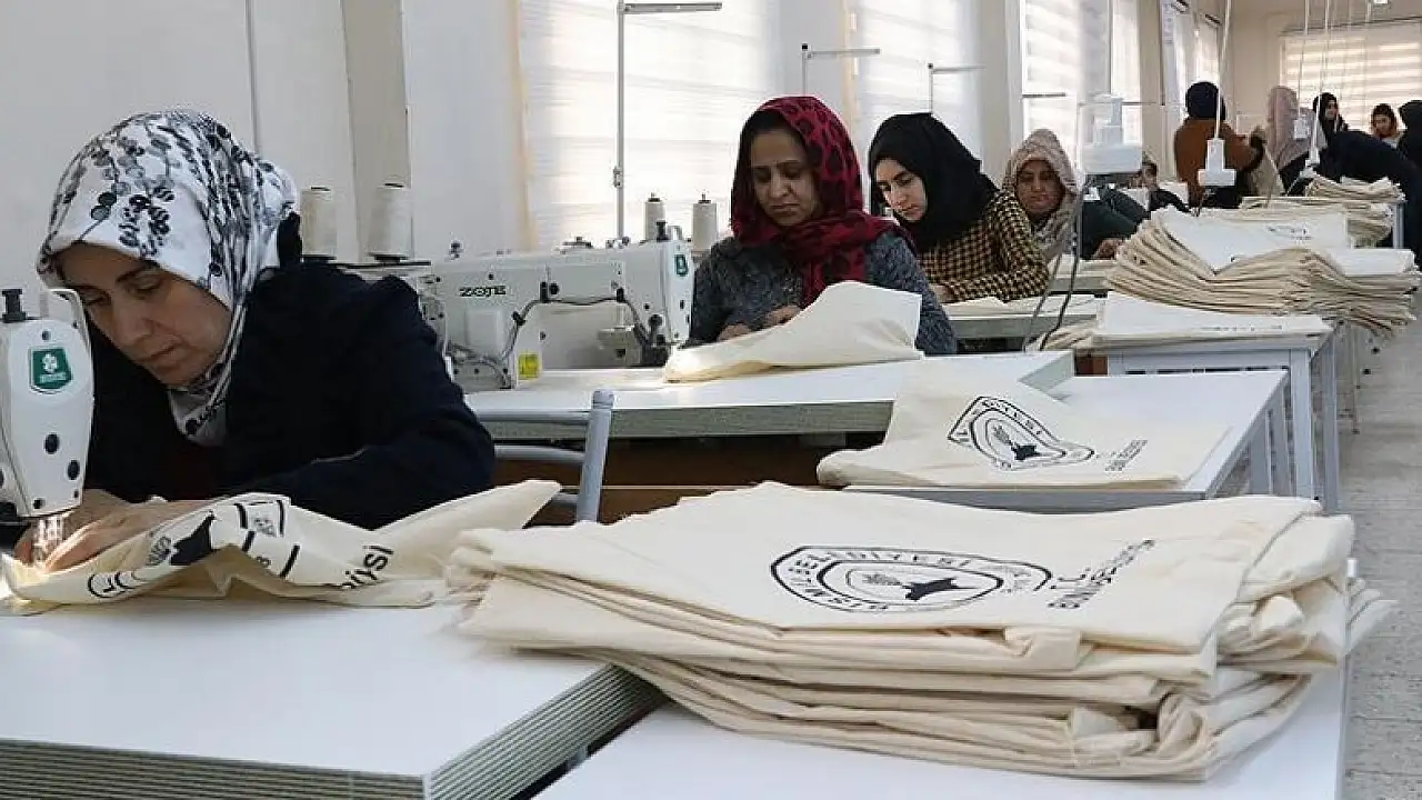 Aile Destek Merkezi (ADEM) bünyesinde dikiş nakış kursuna katılan kursiyerlerce hazırlanan 50 bin bez torbanın ilçede dağıtımına başlandı.
