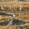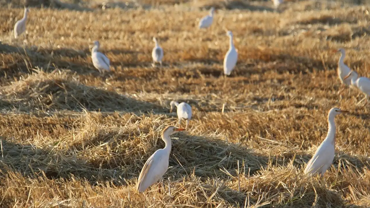 Konya'nın Hüyük ilçesinde hububat hasadının başlamasıyla Beyşehir Gölü kıyılarına yakın tarlalara sürüler halinde inen sığır balıkçılları, biçerdöverin peşine takılıp çekirge ve diğer böceklerle besleniyor.