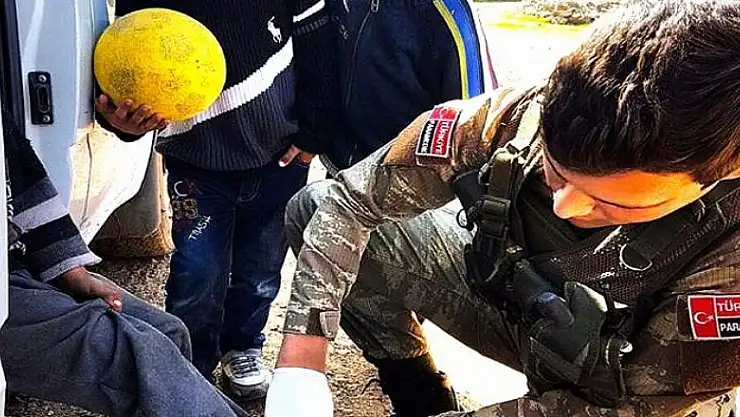 Yaralı kardeşlerden birine, Mehmetçik anında müdahale etti. Mehmetçik'in yaralı çocuğa yaptığı müdahale twitter'da Derinkuvvet hesabı tarafından paylaşıldı.