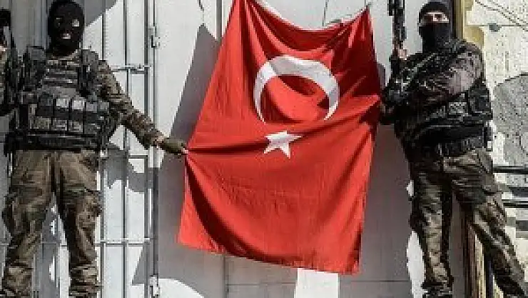 Mahallelerin teröristlerden temizlenmesinin ardından polisler, Çakır'ın teröristlerce şehit edildiği binaya büyük boy Türk bayrağı astı.