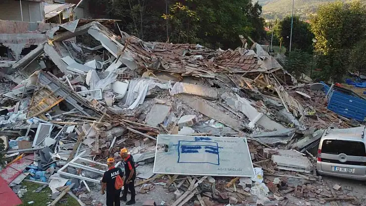 Sındırgı depreminde çöken bina sabahın ilk ışıkları ile havadan görüntülendi