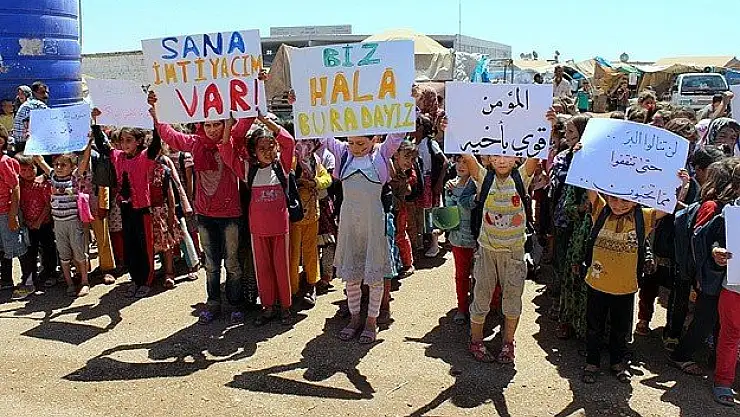 Arapça, İngilizce ve Türkçe yazdıkları ''Bizi unutmayın", "Biz hala buradayız", "Sana ihtiyacım var", "Bize yardım gönderin", "Müslümanlar kardeştir'' pankartlarla taleplerini dile getiren Suriyeliler, özellikle su ve gıda ihtiyaçlarının her geçen gün arttığını kaydettiler.