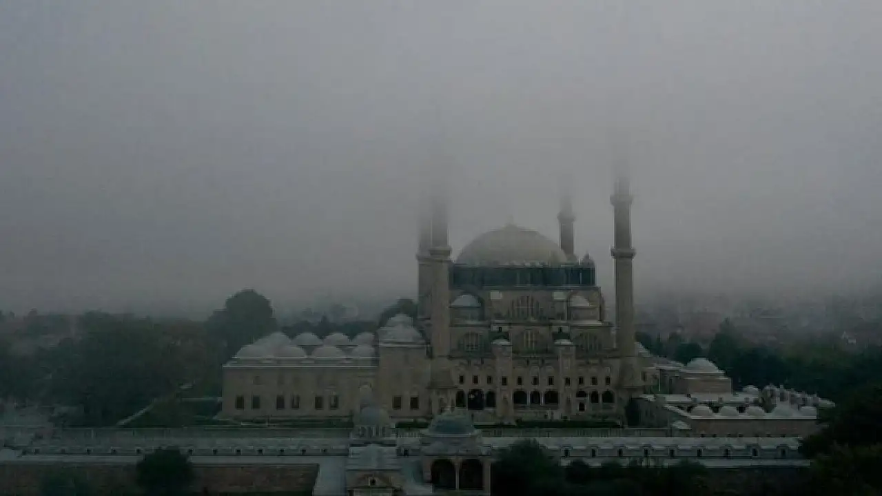 Edirne'de yer yer etkili olan sis Selimiye'nin minareleri ve kubbesini kapladı. Selimiye, sisle kartpostallık görüntüler sergiledi.
