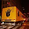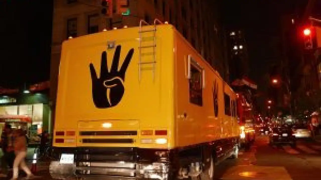 ABD'deki Mısırlılar, akşam saatlerinde üzerinde Rabia işareti bulunan sarı renkli bir otobüsle ve üstü açık şehir turu otobüsüyle Manhattan sokaklarında "Sisi'yi New York'ta görmek istemedikleri" mesajı verdi.