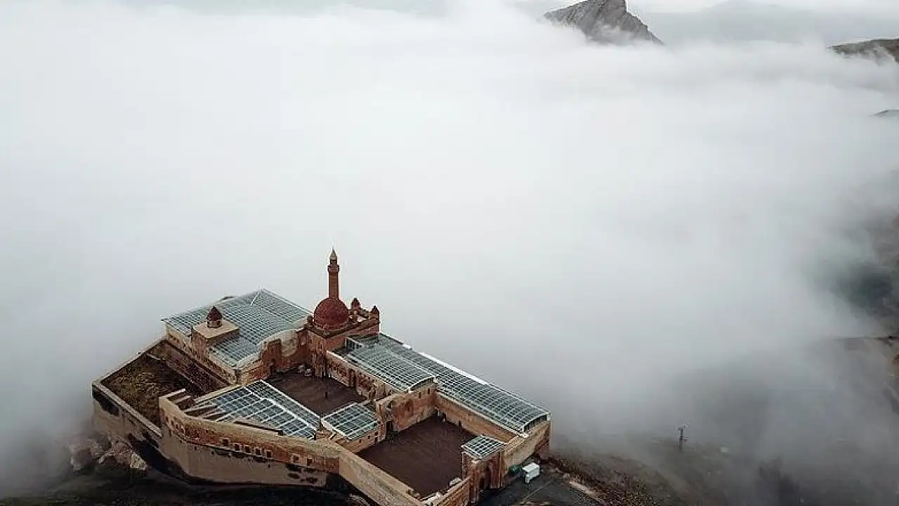 Türkiye'nin en doğusunda bulunan ve UNESCO Dünya Miras Geçici Listesi'nde yer alan İshak Paşa Sarayı, oluşan sis bulutu içinde muhteşem manzara sergiledi.