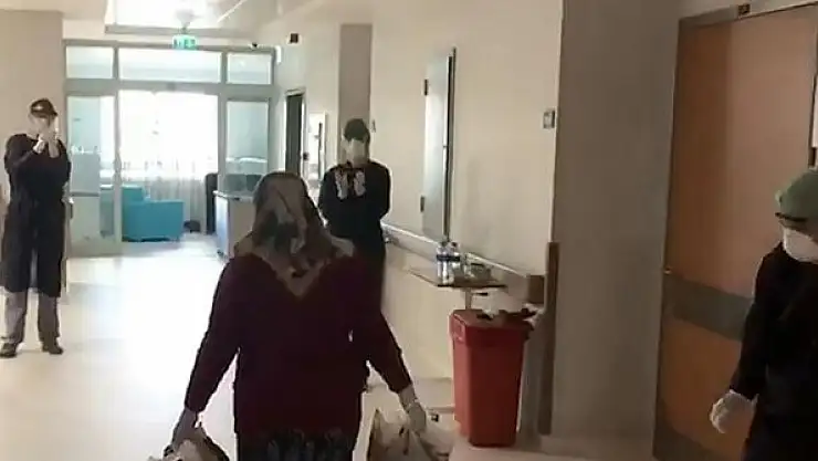 Görüntüde bir sağlık çalışanının, "Hatice teyze maskeni takar mısın?" demesinin ardından tedavisi tamamlanan hasta odasından dışarı çıkıyor.