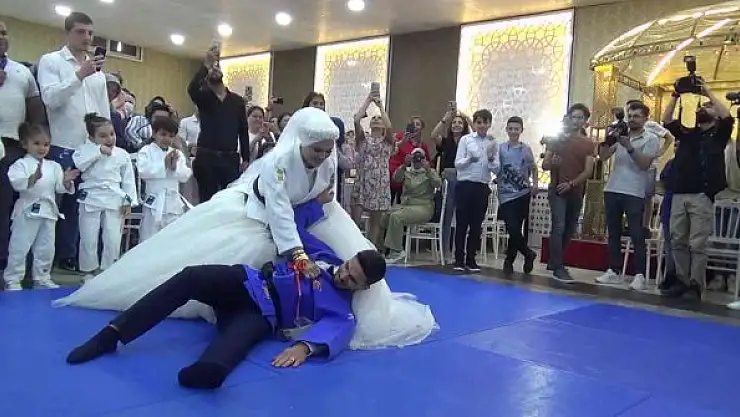 Judo antrenörlüğü yapan siyah kuşak sahibi gelin ile damat nikah öncesi judo kıyafeti giyerek gösteri yaptı. Gösteride gelin, damadı yerden yere vurarak unutulmaz anların yaşanmasına neden oldu.