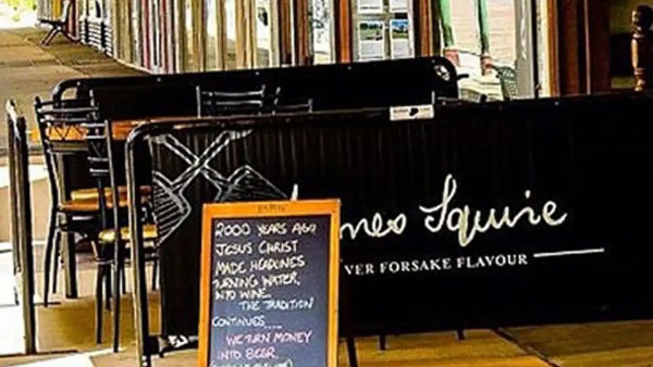 Restoranın sahibi John Hawkes, işyerinin önündeki günlük menülerin yer aldığı tabelaya, ''2 bin sene önce Hazreti İsa suyu şaraba değiştirdiği için haber başlıklarına çıkmıştı. Gelenek devam ediyor, biz de parayı biraya çeviriyoruz. Özür dileriz, Müslümanlar giremez'' yazdı.